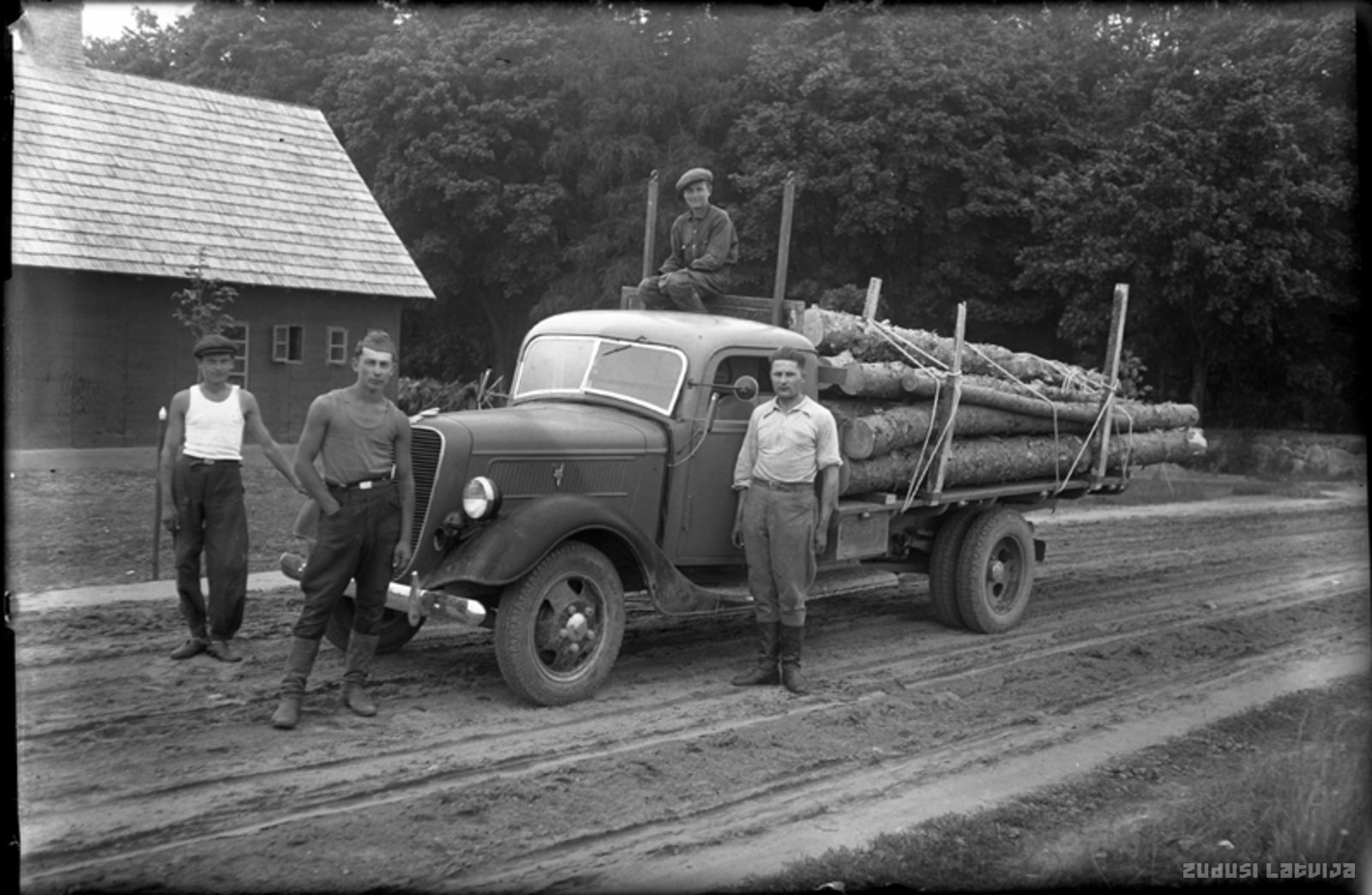 Strādnieki pie kravas mašīnas ar baļķiem 20. gadsimta 20. gados