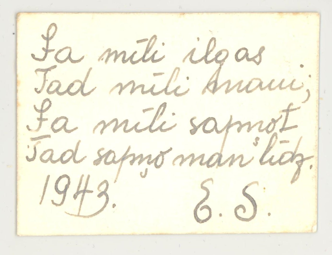 Fotogrāfijas otrā pusē ar roku rakstīts teksts: ''Ja mīli ilgas Tad mīli mani, Ja mīli sapņot Tad sapņo man līdz." 1943. E.S.