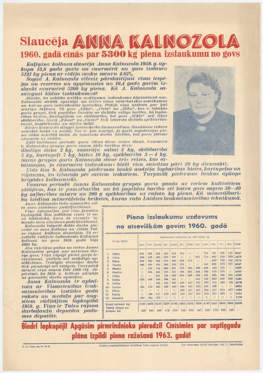 Slaucēja Anna Kalnozola 1960. gadā cīnās par 5300 kg piena izslaukumu no govs. Biedri lopkopēji! Apgūsim pirmrindnieku pieredzi! Cīnīsimies par septiņgadu plāna izpildi piena ražošanā 1963. gadā!