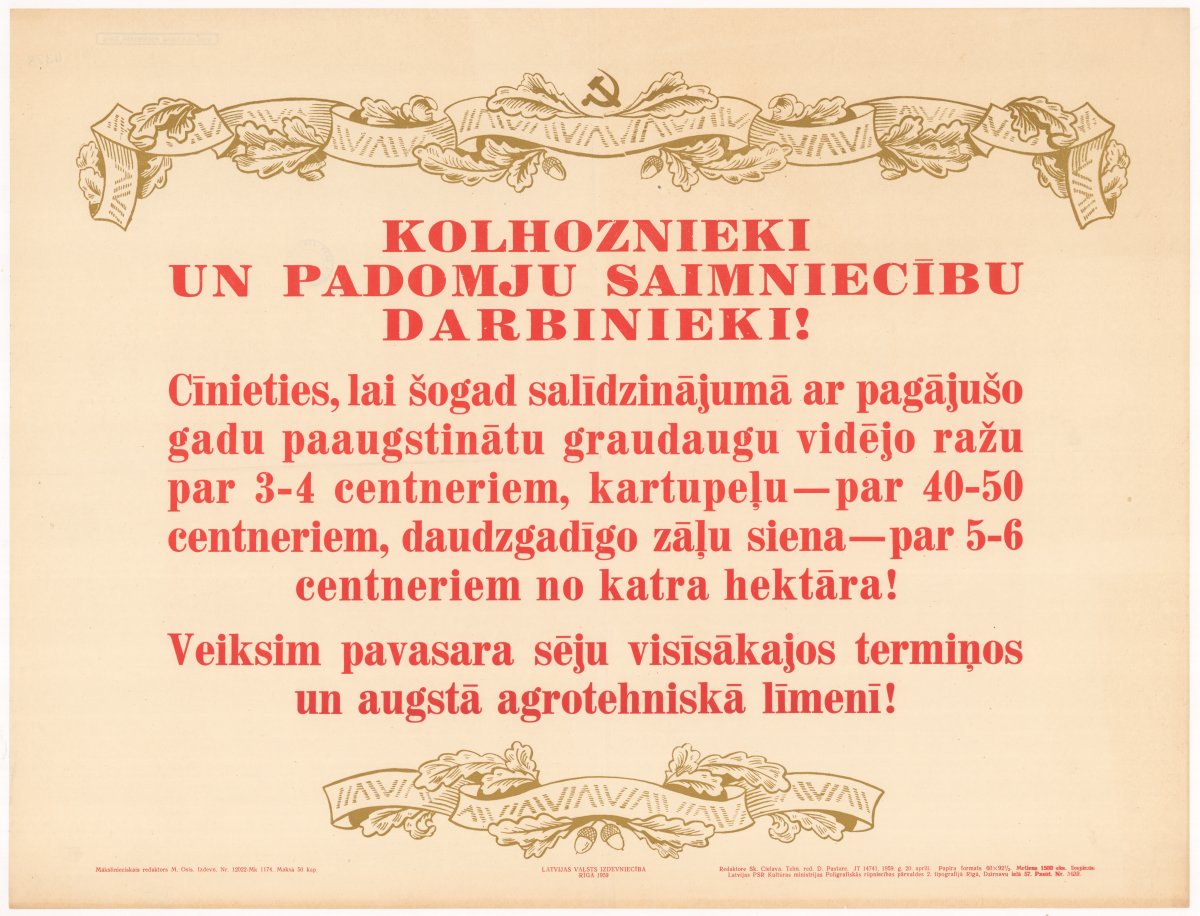 Kolhoznieki un padomju saimniecību darbinieki! Cīnieties, lai šogad salīdzinājumā ar pagājušo gadu paaugstinātu graudaugu vodējo ražu par 3-4 cetneriem, kartupeļu - par 40-50 centneriem, daudzgadīgo zāļu siena - par 5-6 centneriem no katra hektāra! Veiksim pavasara sēju visīsākajos termiņos un augstā agrotehniskā līmenī!