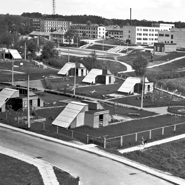 Fotogrāfijā redzams bērnudārza "Ezītis" rotaļu laukums. Bērnudārzs atvērts 1987.gadā.