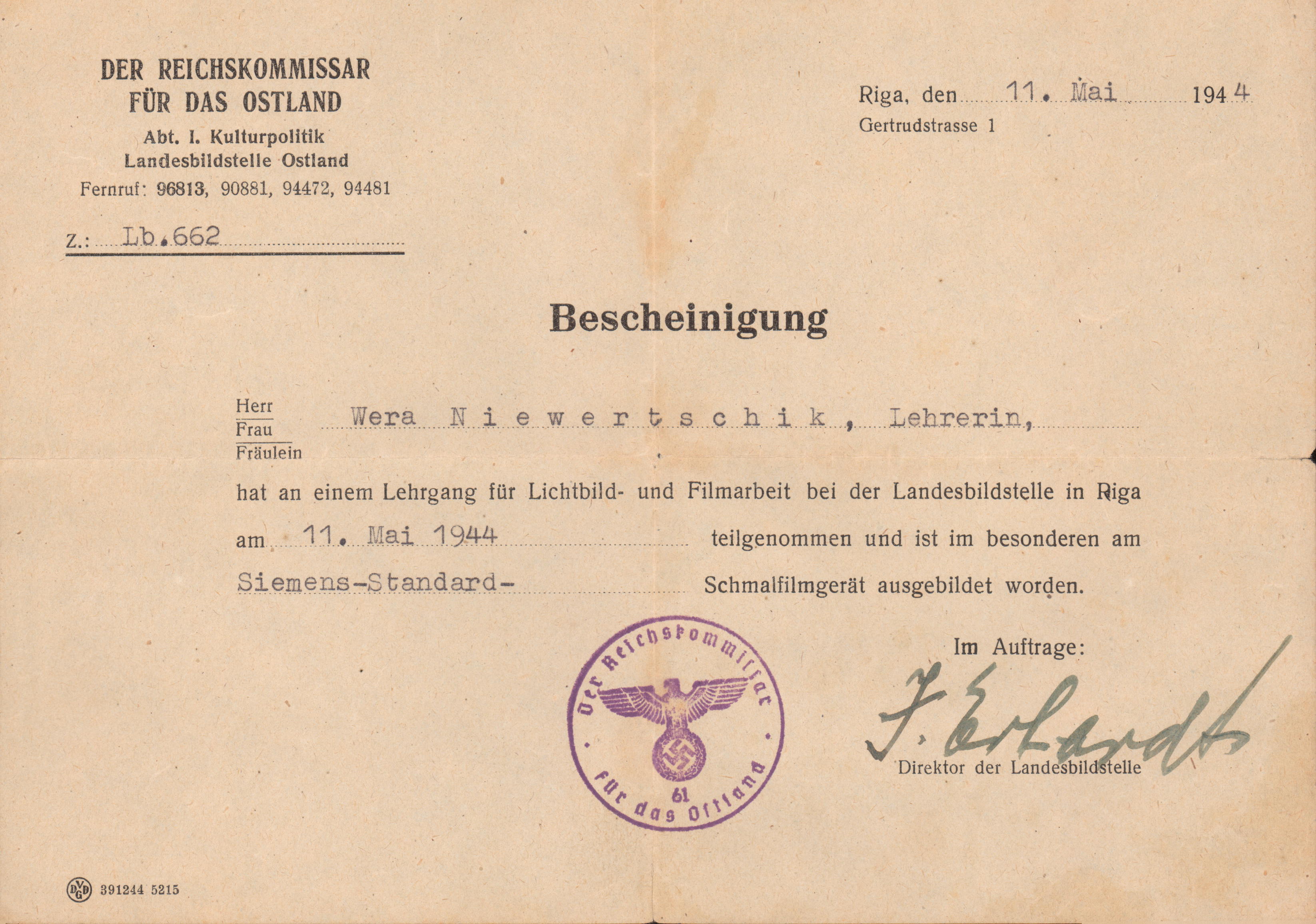 Austrumu teritoriju Valsts tēla kultūrpolitikas nodaļas sertifikāts izsniegts skolotājai Verai Neverčiks 1944. gada 11. maijā Rīgā, ka viņa apmeklējusi foto un kino kursus.