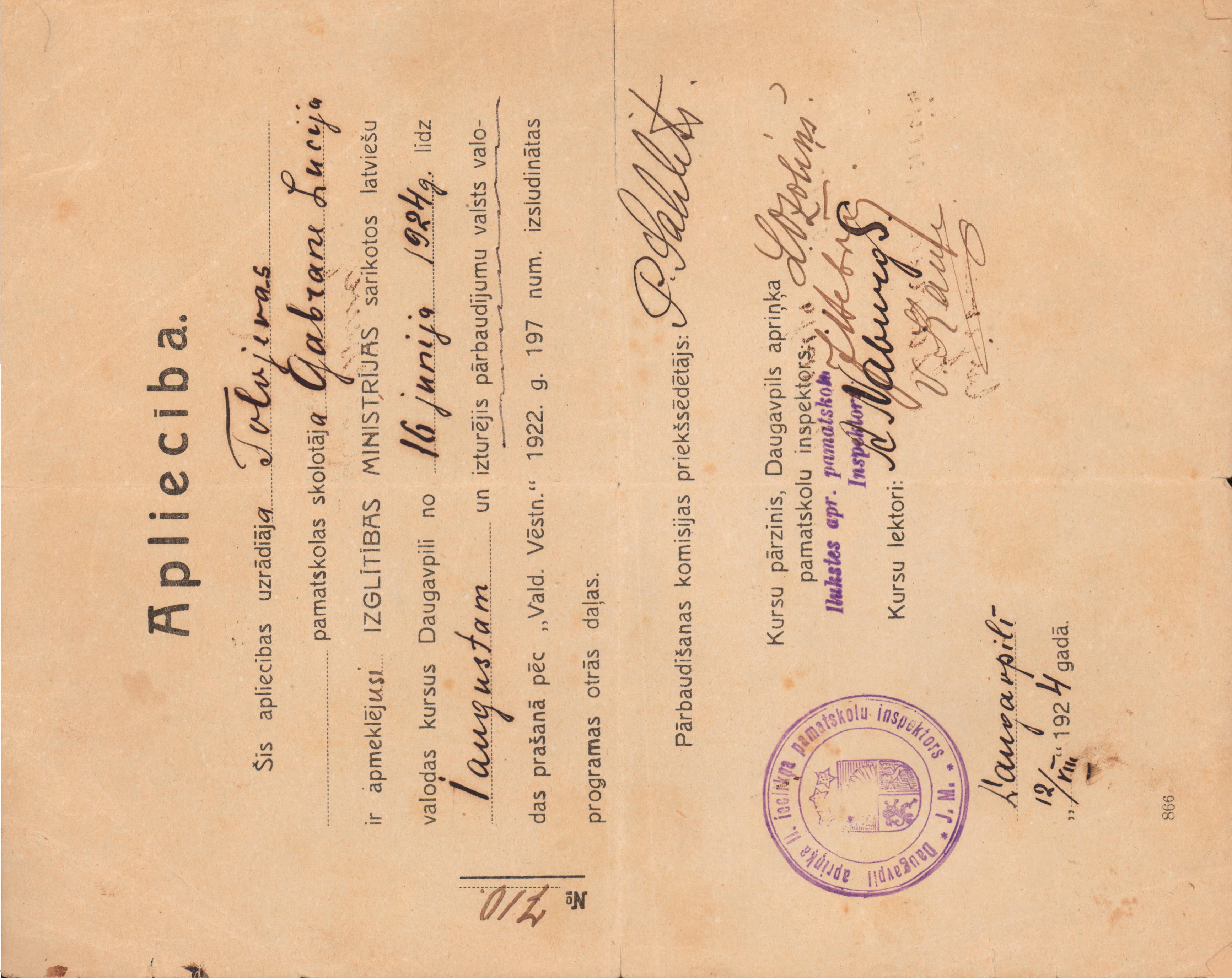 Apliecība izsniegta skolotājai Lucijai Gabranei, ka viņa apmeklējusi Izglītības ministrijas latviešu valodas kursus Daugavpilī no 1924. gada 16. jūnija līdz 1. augustam un izturējusi pārbaudījumu valsts valodas prašanā. Daugavpilī, 1924. gada 12. augustā.