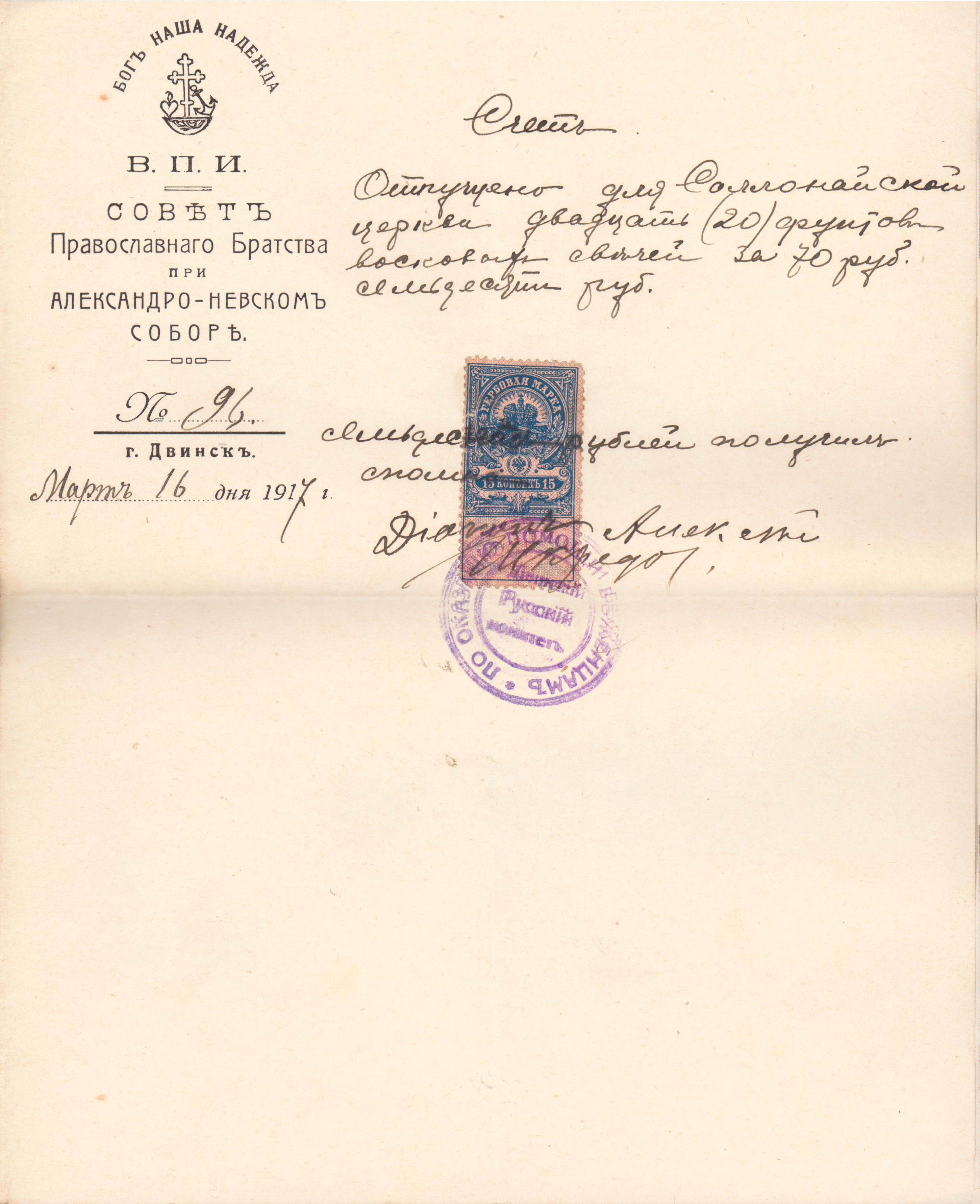 Rēķins izrakstīts uz Aleksandra Ņevska katedrāles Pareizticīgo Brālības padomes veidlapas krievu valodā rokrakstā par 20 vaska sveču pārdošanu Salienas baznīcai par summu 70 rubļu. Dvinskā, 1917. gada 16. martā.