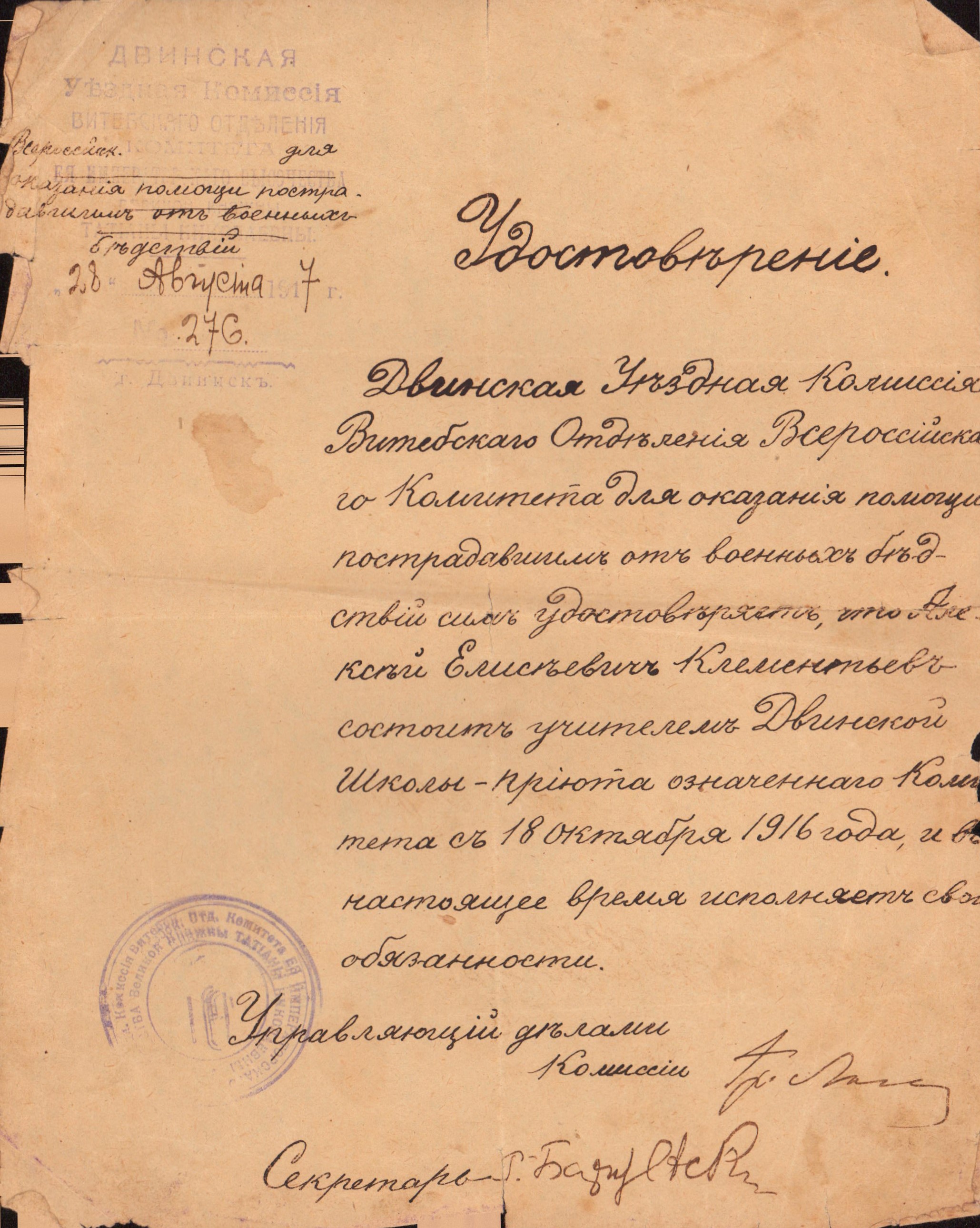 Dokuments krievu valodā izsniegts kā apliecinājums, ka komiteja nozīmējusi Aleksiju Jelisejeviču Klementjevu par skolotāju darbam Dvinskas patversmes skolā no 1916. gada 18. oktobra un ka viņš šobrīd pilda savus pienākumus. Ir lietu pārvaldnieka un sekretāra paraksti.