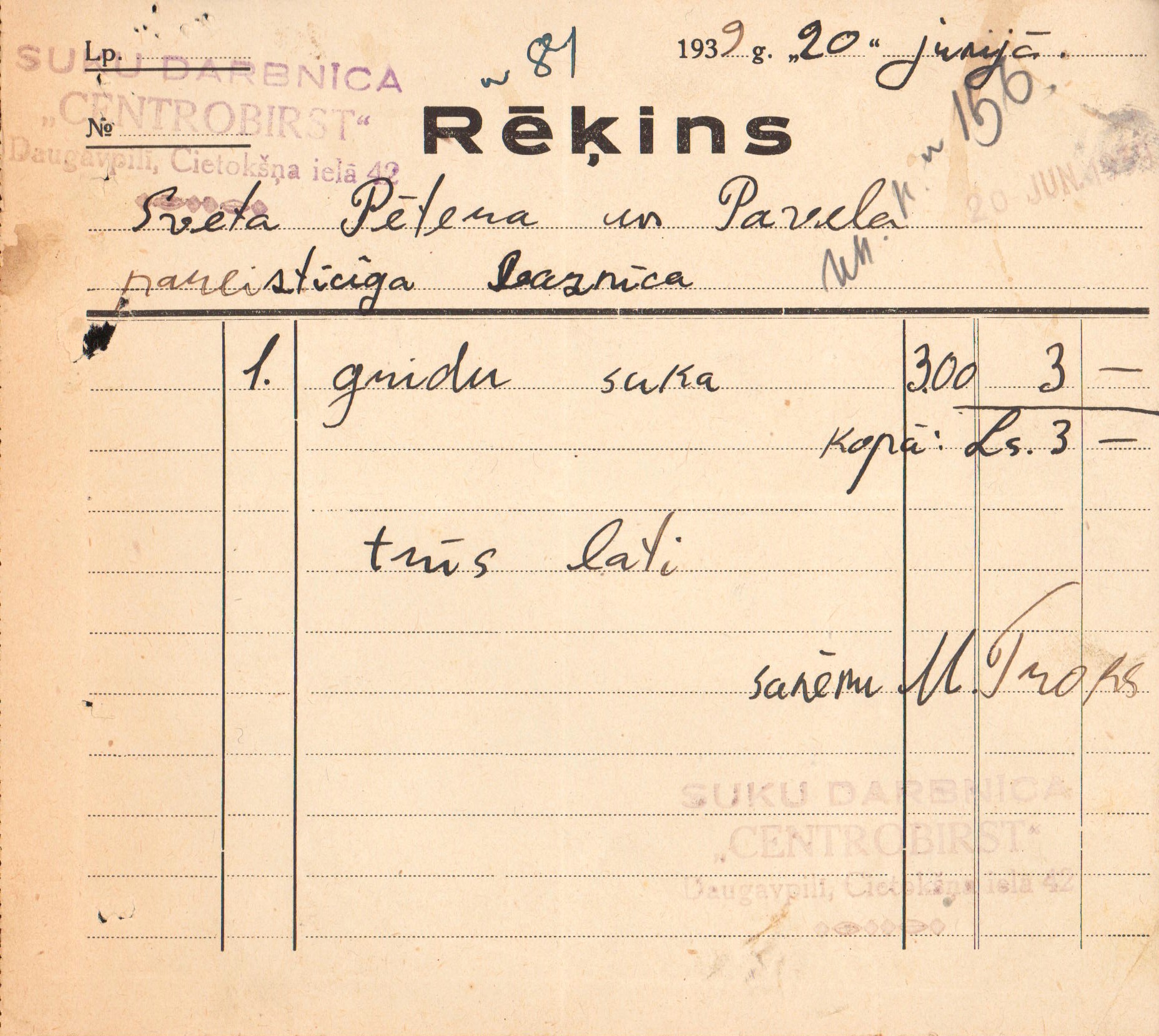 Suku darbnīcas “Centrobirst” rēķins izrakstīts Svētā Pētera un Pāvela pareizticīgo baznīcai 1939. gada 20. jūnijā.
