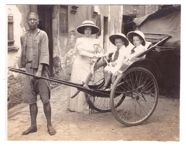 "Šanhajas „rikša" Mi 8765. Pie ratiņiem bij. Latvijas priekšstāvja Ķīnā un Tālos Austrumos R.Valdmaņa k-dze; ratiņos Valdmaņa dēli Tobijs un Lians."