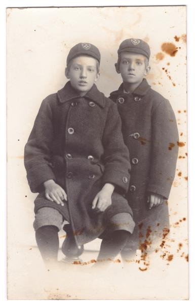 Atklātnē redzami pirmā Latvijas Republikas goda konsula Šanhajā (Ķīnā) Roberta Valdmaņa dēli skolas (?) formas tērpos. Uz brāļu cepurēm, iespējams, attēlots brīvmūrnieku simbols - taisnstūris un cirkulis. Pirmais no kreisās puses Lians Valdmanis un blakus viņam brālis Tobijs Valdmanis.