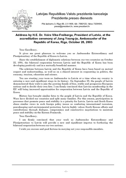 Address by H.E. Dr. Vaira Vike-Freiberga, President of Latvia, at the accreditation ceremony of Jung Young-jo, Ambassador of the Republic of Korea, Riga, October 28, 2003