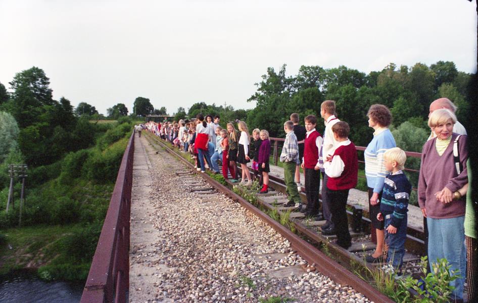 Fotogrāfijā redzami nometnes "3x3" akcijas "Lai neaizaug mūsu dzelzceļš!" dalībnieki uz dzelzceļa tilta Mazsalacā 1998.gada 18.jūlijā.