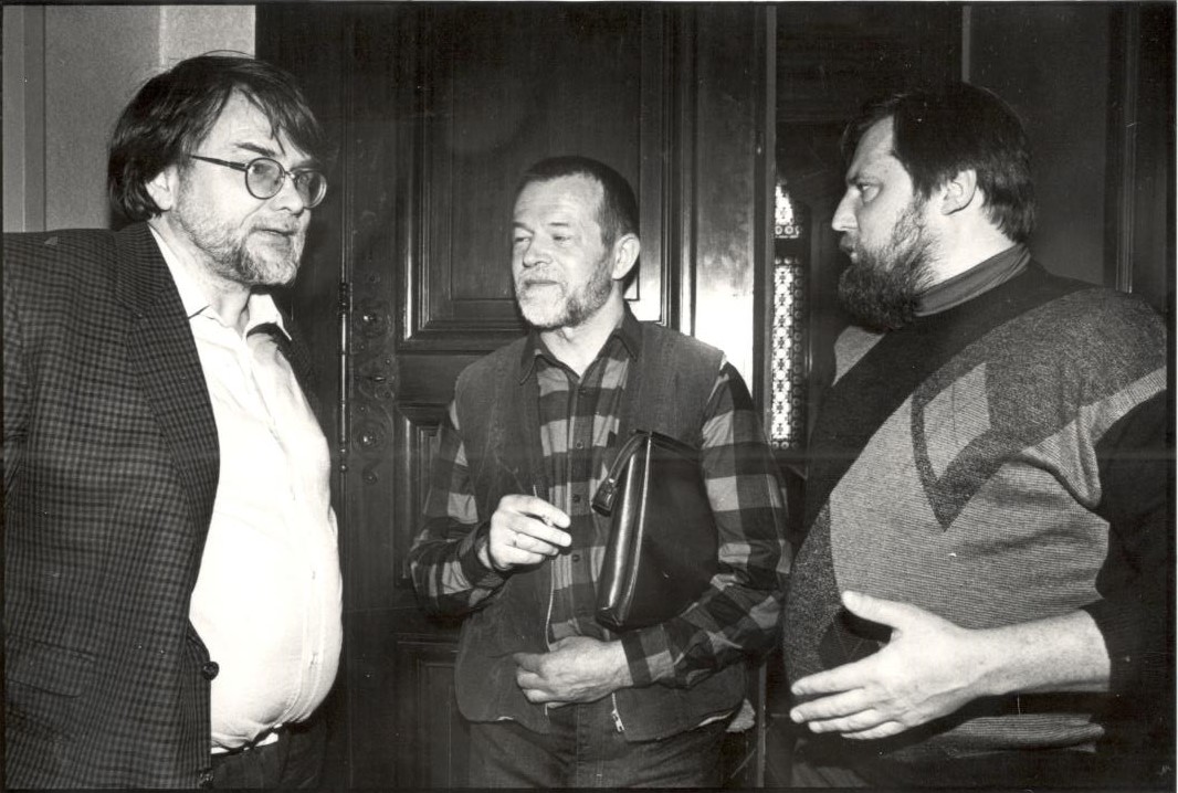 Pēters Brūveris Rakstnieku konferencē ar dzejniekiem Uldi Bērziņu un Jāni Baltvilku