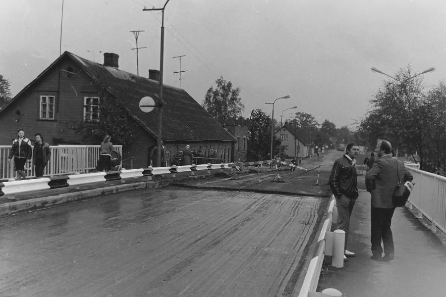 Fotogrāfijā redzams tilts pār Gauju Valmierā tā virskārtas seguma atjaunošanas laikā 1991.gadā. Kreisajā pusē redzamas koka privātmājas.