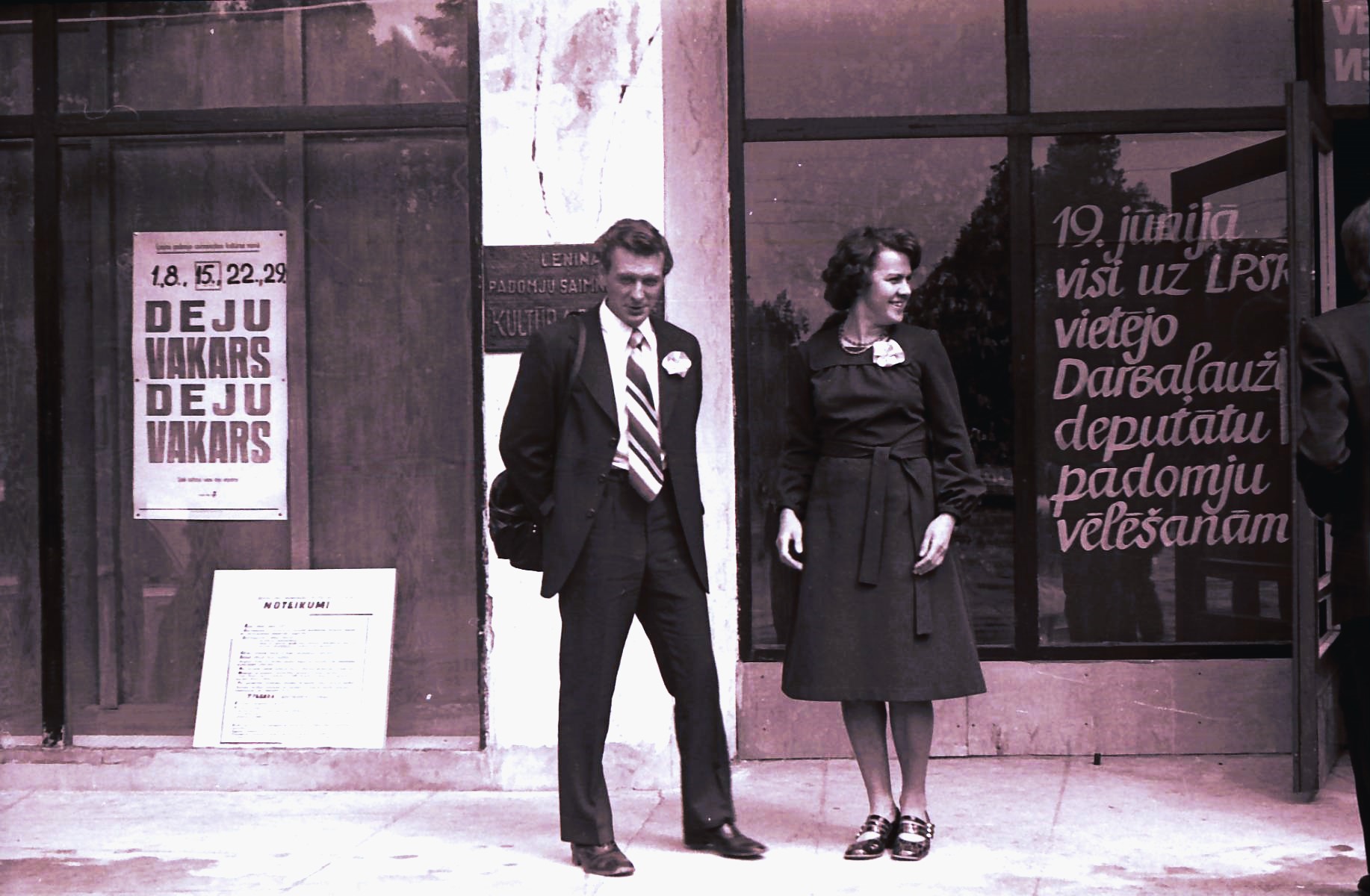 Iemūžināts mirklis no Broņislava Bruno bērnu bērnības svētku dienas. Toreiz bērnus kristīt nevarēja, bet bija tā saucamie “Bērnības svētki”, priekšplānā bērnu krustvecāki Guntis Mezītis un Anita Rūtīte. B. Bruno fotografiju uzņēmis fonā redzamā aģitācijas uzsaukuma dēļ: “19. jūnijā visi uz LPSR vietējo Darbaļaužu deputātu padomju vēlēšanām”.