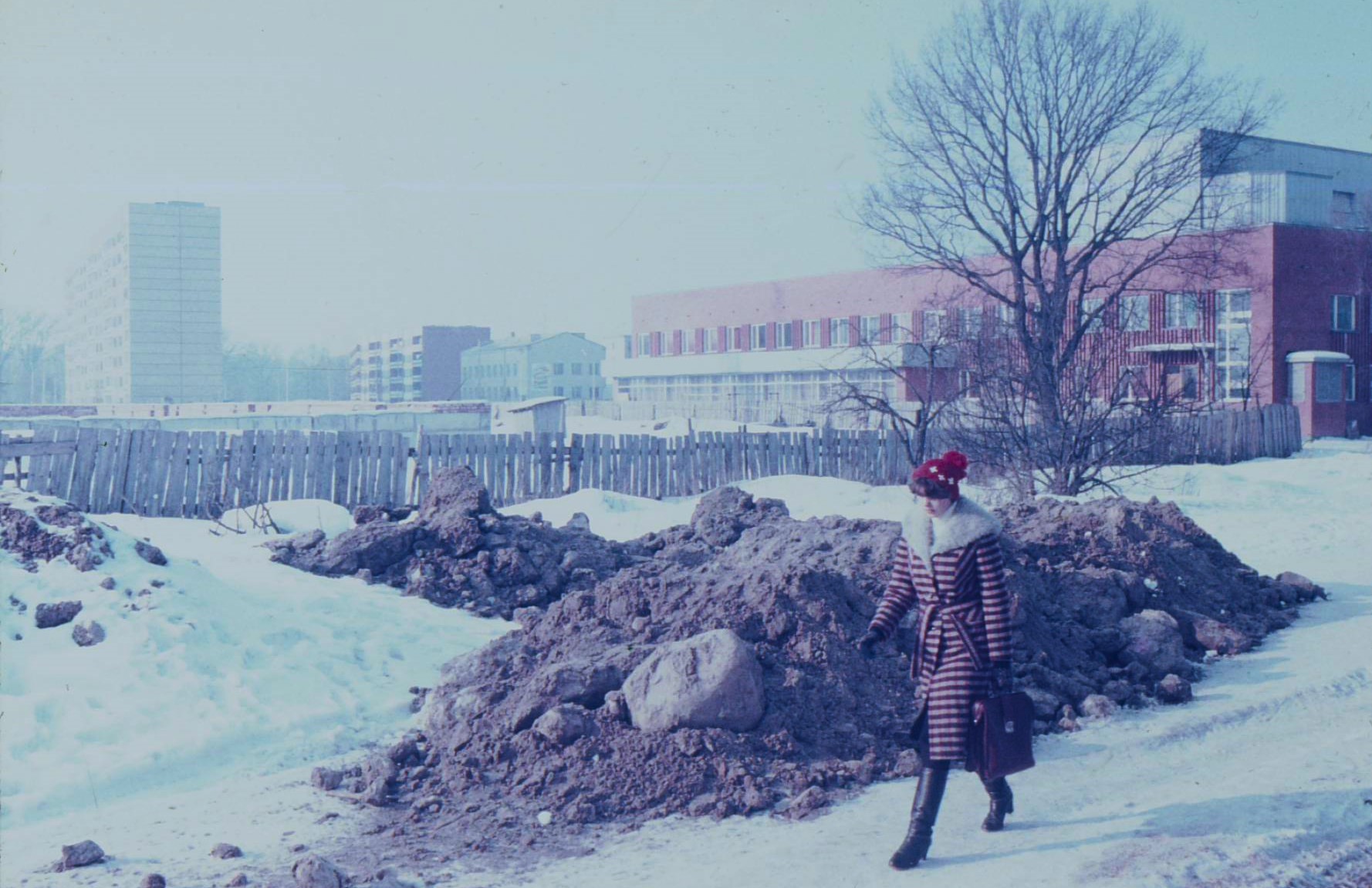 Fonā redzams kultūras nams Enerģētiķis, priekšplānā kultūras nama telpās tolaik izvietota bērnu bibliotēka Avotiņš, tiek celts universālveikals Salaspils, vēlāk saukts Nelda. Fotografēts no Rīgas ielas puses.