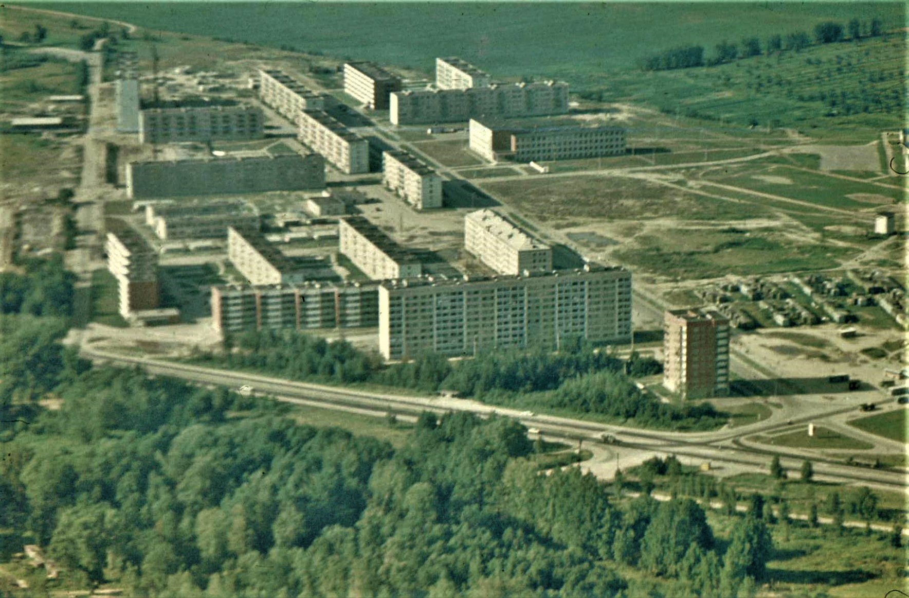 Salaspils jaunceltnes no putna lidojuma, skats no lidmašīnas. Uzņemts, lidojot no Rīgas uz Rumbulas lidostu. Labajā pusē redzami Rīgas HES strādnieku vagoniņi, uz priekšu redzama Skolas iela un Salaspils 2. vidusskolas ēka aiz zaļās pļavas (tagad zaļās pļavas vietā ir lielveikali Rimi, Lidl, Maxima).