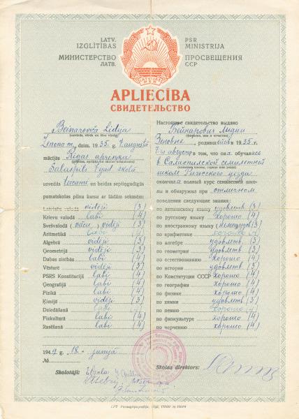 Apliecība izsniegta Beinarovičai Lidijai Zenona m., ka viņa mācījās Rīgas apriņķa Salaspils 7 gad. skolā, uzvedās teicami un beidza septiņgadīgās pamatskolas pilnu kursu. 1949. g. 18. jūnijā. Augšpusē iespiests: Latvijas PSR Izglītības ministrija, Latvijas PSR ģerbonis. Apliecība nodrukāta un aizpildīta rokrakstā latviešu un krievu valodā. Atzīmes izliktas 15 priekšmetos. Skolas direktora un skolotāju paraksti, zīmogs.