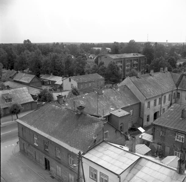 Fotogrāfijā redzams skats uz Rīgas ielu Valmierā no autopacēlāja (t.s. “žirafes”) 1984.gadā.