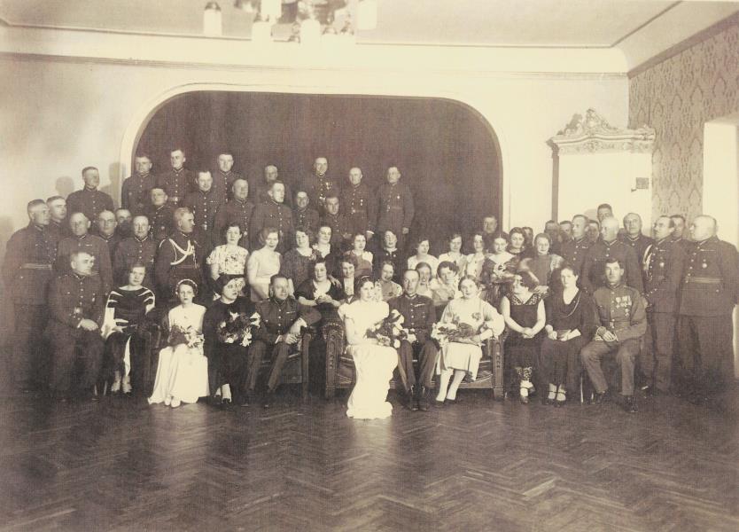 Baltkrievu ģimnāzijas skolotājas Saukānes-Karnauhovas (Visokinska) kāzu kopbilde ar viesiem, starp kuriem esot visa Daugavpils cietokšņa vadība. 20. gs. 30. gadi.