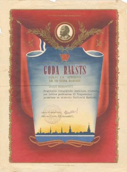 Latvijas ĻKJS Centrālā Komiteja apbalvo Lidiju Beinaroviču, Daugavpils Pedagoģiskā institūta studenti, par labiem panākumiem VI Vispasaules jaunatnes un studentu festivālā Maskavā. Rīgā, 1957. gada 12. decembrī. LĻKJS CK sekretāra paraksts, zīmogs latviešu un krievu valodā: Latvijas Ļeņina Komunistiskās jaunatnes savienība.