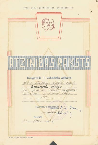 Daugavpils 1. vidusskola apbalvo skolas absolventi soprānu vecāko Beinaroviču Lidiju par parādīto čaklumu uz dziesmu mīlestību, piedaloties skolas korī. Daugavpilī, 1954. gada 26. jūnijā. Daugavpils 1. vidusskolas direktora un kora vadītāja paraksts, skolas zīmogs latviešu un krievu valodā. L. Beinaroviča (prec. Vasaraudze).