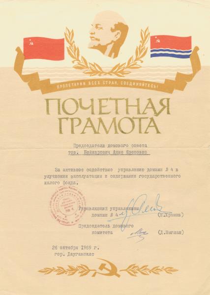Goda raksts krievu valodā mājas padomes priekšsēdētājai Annai Beinarovičai par aktīvu palīdzību namu pārvaldei Nr. 4 valsts dzīvojamā fonda ekspluatācijas un uzturēšanas uzlabošanā. 1969. gada 26. oktobrī, Daugavpils. Namu pārvaldes Nr. 4 pārvaldnieka M. Hramova un māju komitejas priekšsēdētāja D. Miglāna paraksts, sarkans namu pārvaldes Nr. 4 zīmogs.