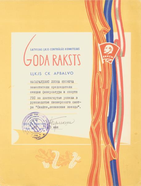LĻKJS CK apbalvo [?] fizkultūras un sporta sekcijas priekšsēdētāja vietnieku Leonu Vasaraudzi par panākumiem pionieru skates vadīšanā. Rīgā, 1967. gada 13. maijā. Zīmogs latviešu un krievu valodā: Latvijas Ļeņina Komunistiskās jaunatnes savienība. LĻKJS CK sekretāra paraksts. Dokumenta pamatforma nodrukāta latviešu valodā, bet apsveikums krieviski.