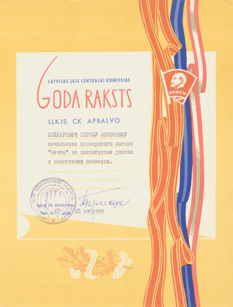 Latvijas ĻKJS Centrālās Komitejas goda raksts pionieru nometnes “Sapnis” vadītājai Terēzei Beinarovičai. 1967. gada 25. augustā. LĻKJS CK sekretāra paraksts, zīmogs latviešu un krievu valodā: Latvijas Ļeņina Komunistiskās jaunatnes savienība.