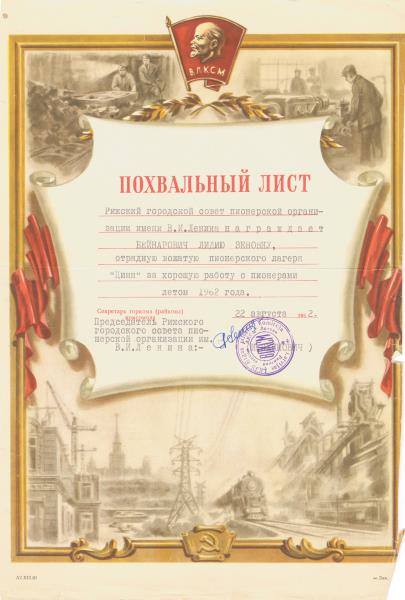 Rīgas pilsētas pionieru organizācijas padomes uzslavas raksts krievu valodā pionieru nometnes vienības vadītājai Lidijai Beinarovičai. 1962. gada 22. augustā. Padomes priekšsēdētāja paraksts, ĻKJS Rīgas pilsētas komitejas zīmogs latviešu un krievu valodā.