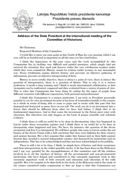 Address of the State President at the International meeting of the Committee of Historians