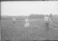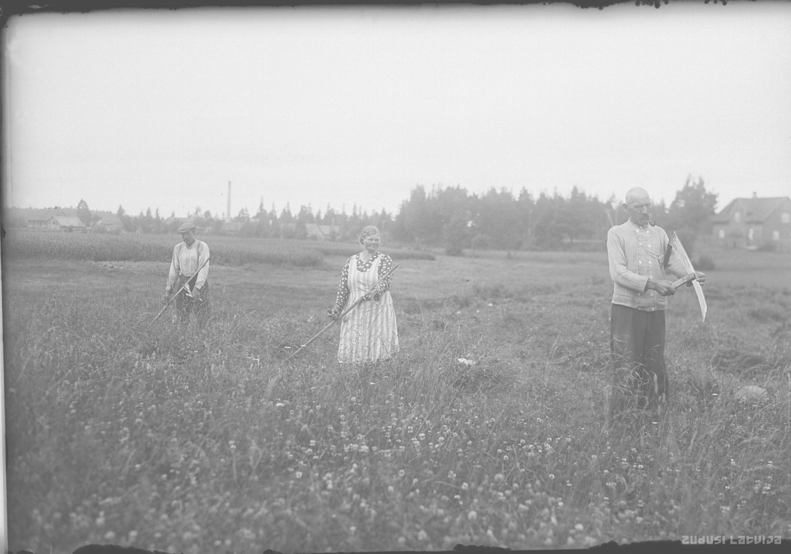 Sieviete un vīrietis pļauj zāli. Vīrietis asina izkapti. Zāles pļaušana 20. gadsimta 20. gados