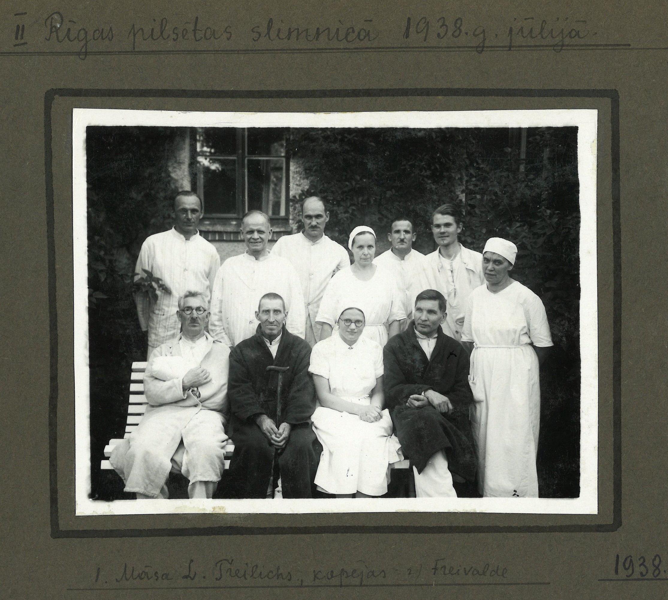 Fotogrāfijā cilvēku grupa slimnīcas pagalmā. Pirmais no labās puses sēž Dāvids Zaķis. Albuma lapas augšpusē uzraksts: 2. Rīgas pilsētas slimnīcā 1938. gada jūlijā. Uz fotogrāfijas uzrakstīti cipariņi 1. un 2., zem fotogrāfijas rakstīts: 1. māsa L. Treilichs, kopējas, 2. Freivalde.