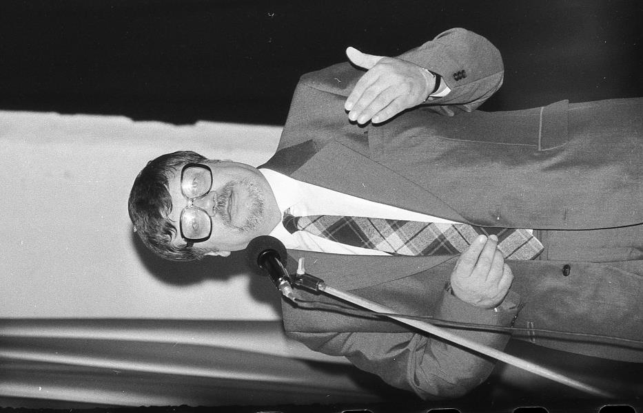 Fotogrāfijā redzams dzejnieks, sabiedriskais darbinieks un politiķis Jānis Peters vizītē Mazsalacas Kultūras namā 1989.gada martā.