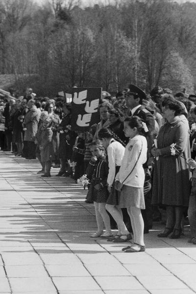1985.gada 9.maijā Lucas kalnā Valmierā atklāja memoriālu Otrajā pasaules karā kritušajiem karavīriem. Fotogrāfijā redzami svinīgā pasākuma apmeklētāji, to vidū gan pieaugušie, gan bērni. Padomju varas laikā šādu pasākumu apmeklēšanu uzskatīja par vienu no komunistiskās audzināšanas formām.