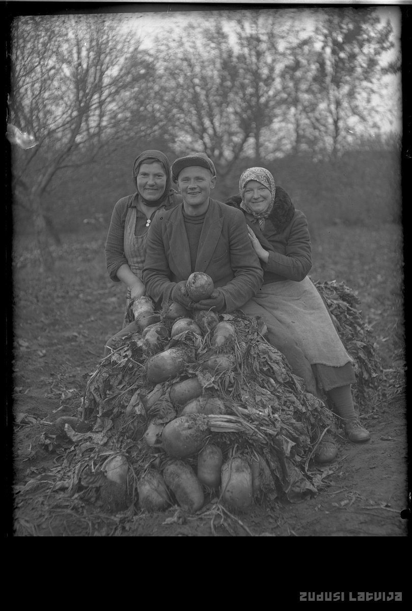 Divas sievietes un vīretis sēžot novākto cukurbiešu kaudzē 20. gadsimta 20. gados
