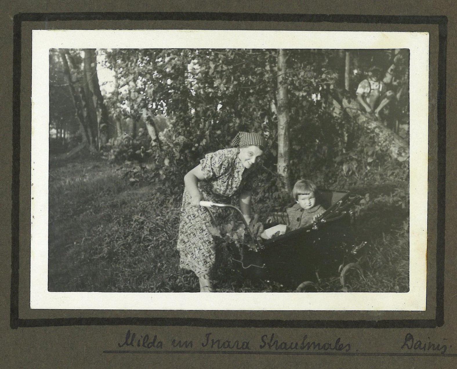 Fotogrāfija no Kauguru skolas skolotāja Dāvida Zaķa albuma. Fotogrāfijā pirmā no kreisās puses Milda Strautmale, otrā Inara Strautmale (bērns ratiņos), un trešais Dāvida Zaķa dēls Dainis Zaķis (sēž uz koka stumbra). Albuma lapas augšpusē rakstīts: "Mūrmuižā 1940. gada vasarā." Zem fotogrāfijas rakstīts: "Milda un Inara Strautmales. Dainis."