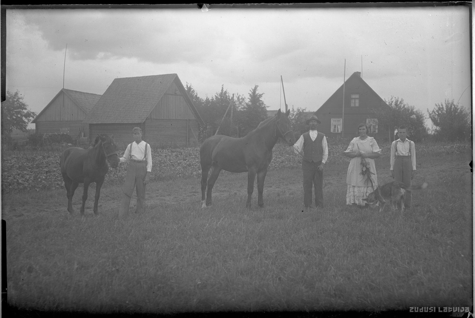 Zemnieki lauku darbos. Divi vīrieši, sieviete un zēns, blakus divi zirgi un suns. 20. gadsimta 20. gadi