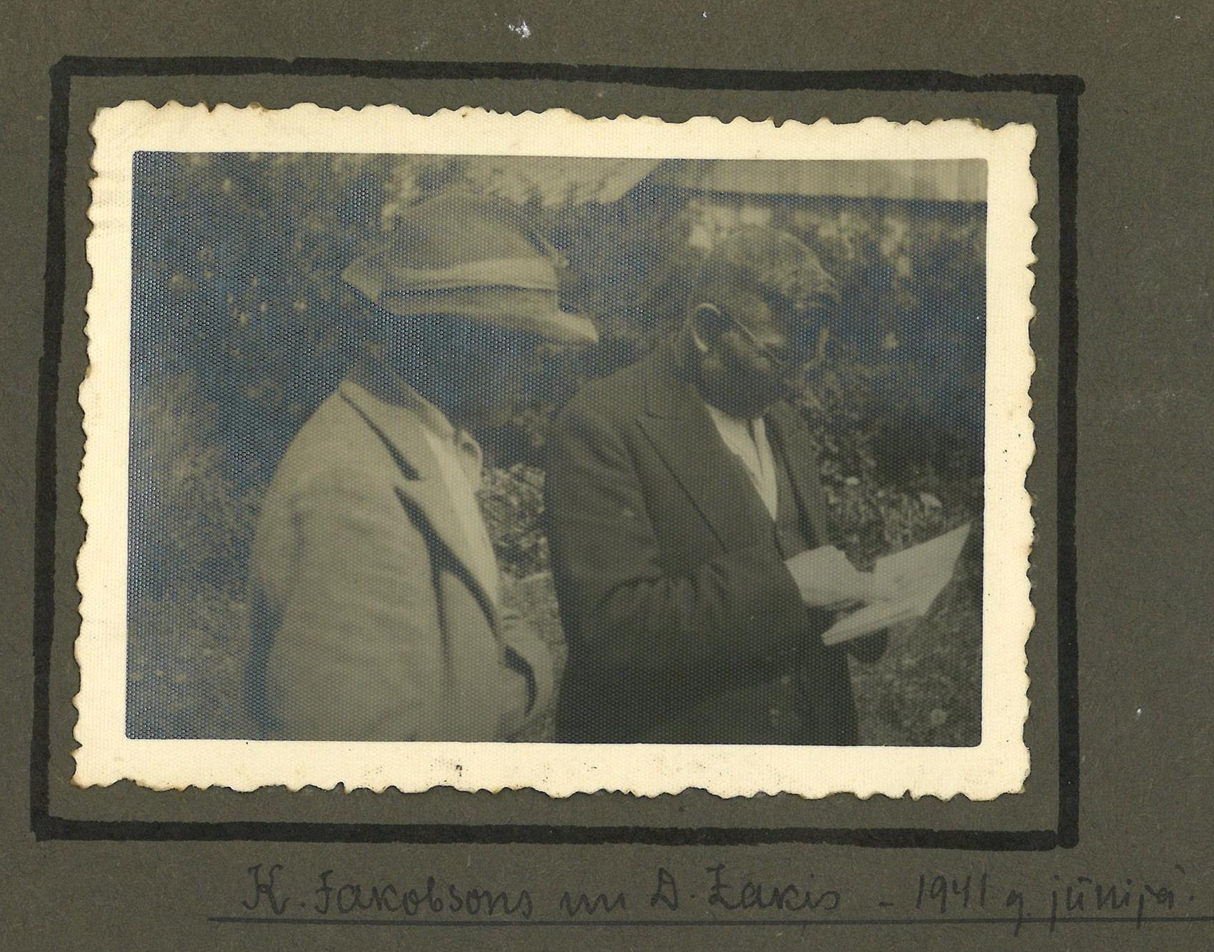 Fotogrāfijā redzams K.Jakobsons (pirmais no kreisās puses) un Dāvids Zaķis (otrais no kreisās puses). Zem fotogrāfijas rakstīts: "K. Jakobsons un D. Zaķis 1941. g. jūnijā."