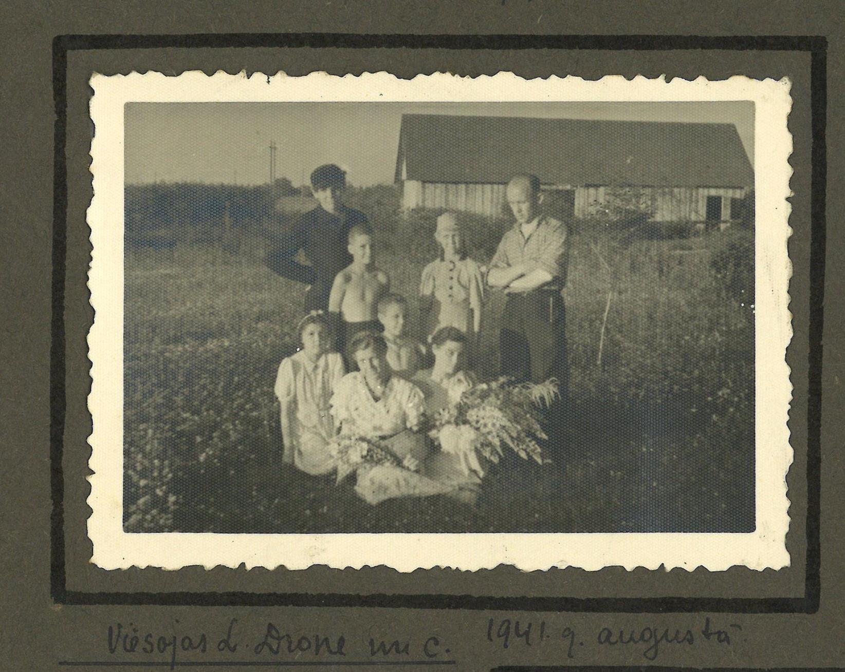 Fotogrāfija no Kauguru skolas skolotāja Dāvida Zaķa albuma. Fotogrāfijā redzami cilvēki lauku sētā, fonā redzams šķūnis. Zem fotogrāfijas rakstīts: "Viesojas L. Drone un c. 1941. g. augustā."