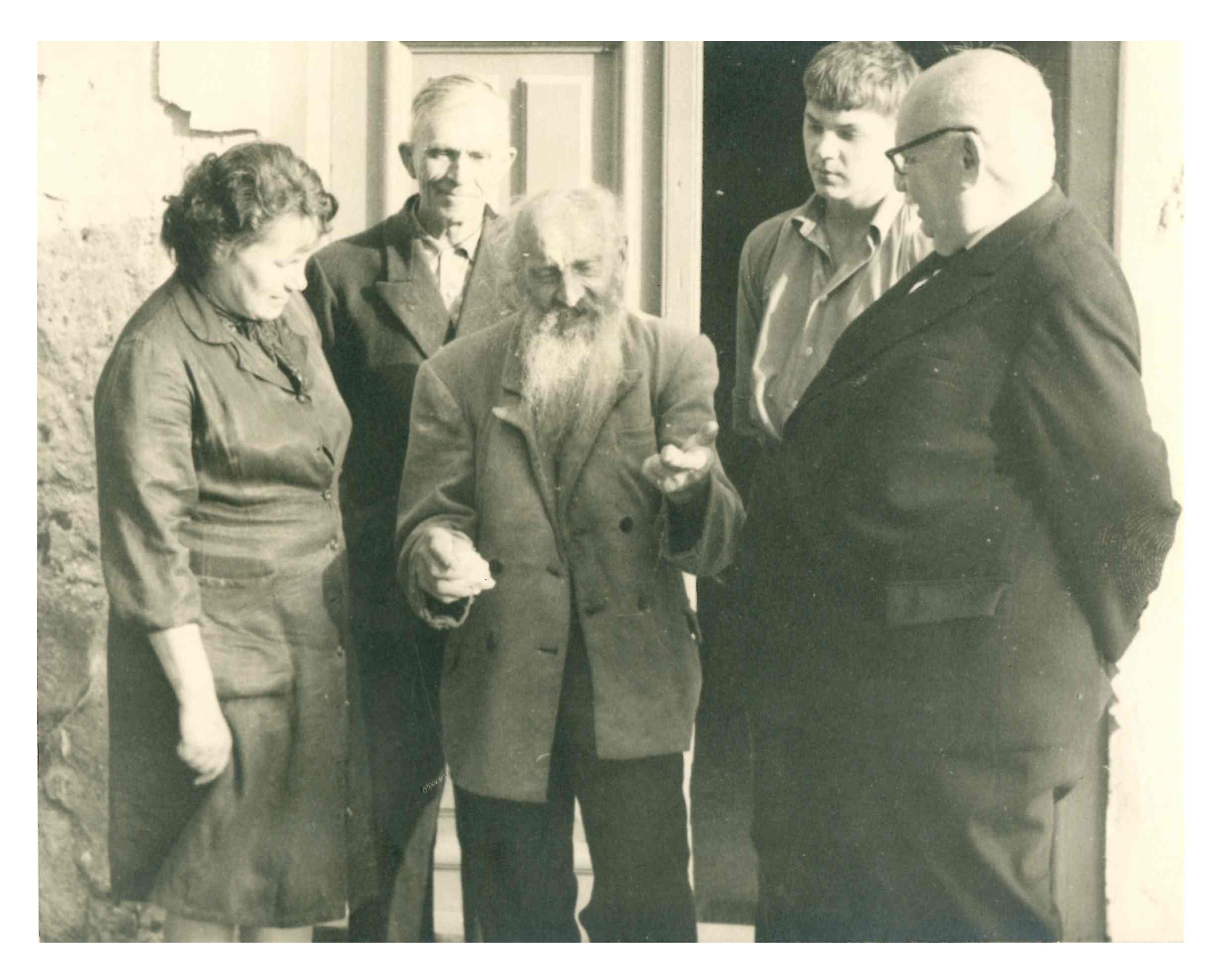 Filmas "Kauja pie Knipskas" komanda tiekas ar Jāni Ronīti (vidū) pie Druvienas Vecās skolas - muzeja 1970. gadā.