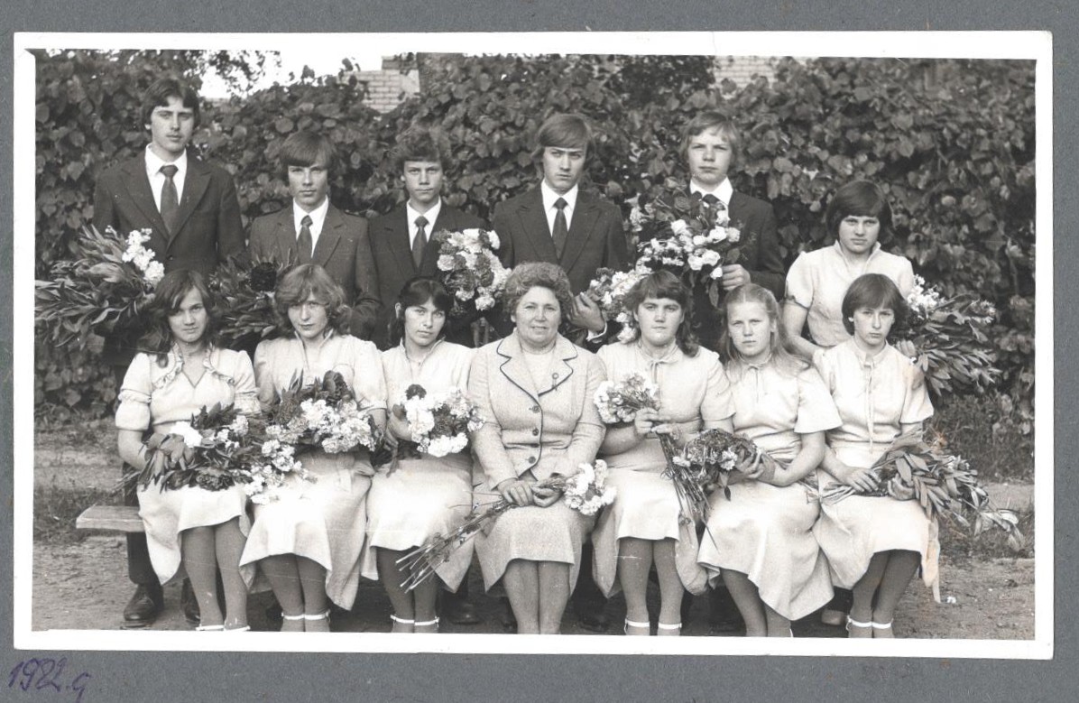 No kreisās: absolventi Māris Bērziņš, Jānis Japiņš, Aigars Mednis, Artis Mezītis, Aldis Emsiņš, Ligita Ābeltiņa, Inga Grase, Daina Strupka, Leila Mamedova, skolotāja Gaļina Merenkova, Dace Mikāne, Svetlana Petrova, Zaiga Bērziņa.