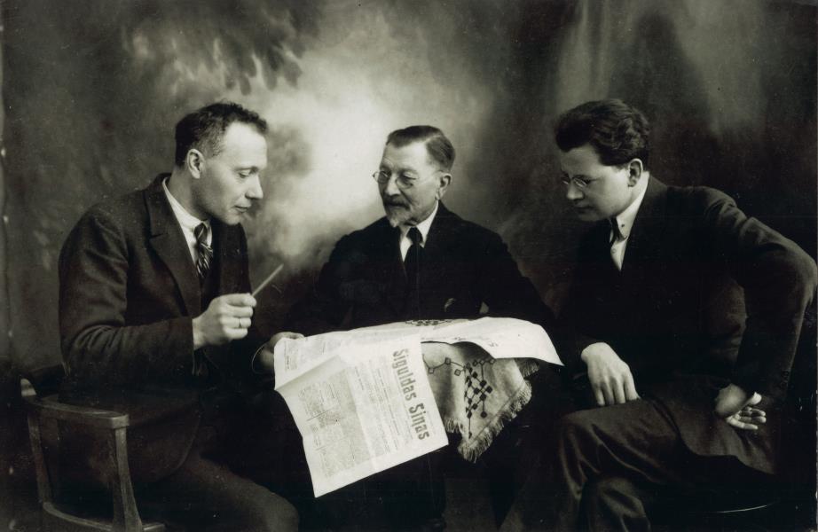 Laikraksta “Siguldas Ziņas” redakcijas darbinieki. Pirmais no labās puses – Jānis Zuze - pirmais Siguldas pilsētas bibliotēkas pārzinis, Rakstnieku pils bibliotekārs un pilsētas domnieks
