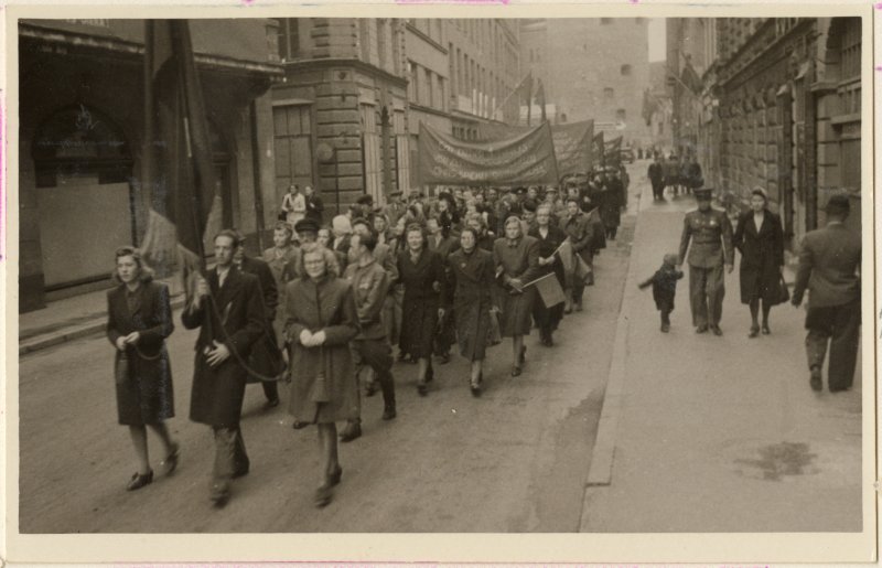 Valsts bibliotēkas darbinieki 1946. gada 1. maija svinību gājienā