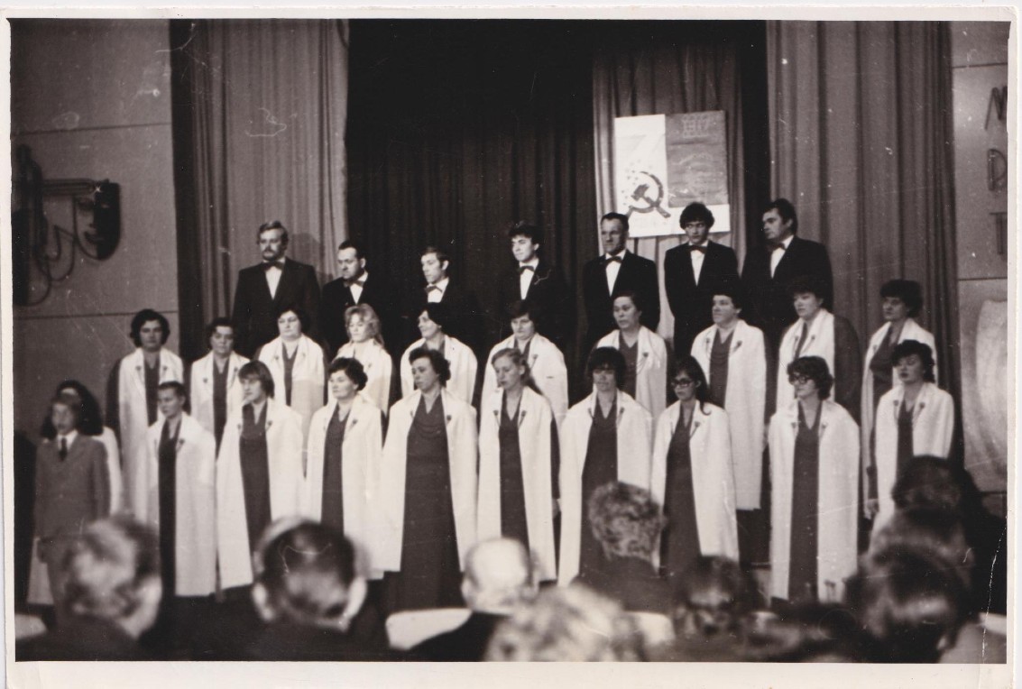Jauktais koris "Ozolzīle". Kora pirmie tērpi, aveņsarkanas kleitas ar baltām villainēm. Attēlā redzami 1981.gada "Oktobra svētki", kuri tolaik bija obligāti svinami.