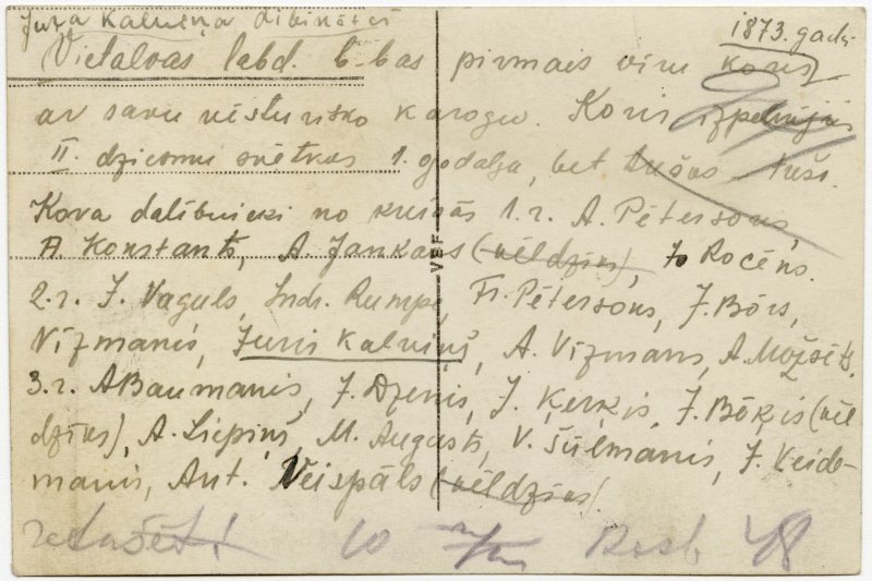 Fotogrāfijai otrā pusē ieraksts par attēlā redzamajām personām. Pirmajā rindā no kreisās puses: A. Pētersons, A. Konstants, A. Jankavs, J. Rocēns. Otrajā rindā: J. Vaguls, Indr. Rumpe, Fr. Pētersons, J. Bors, Vīzmanis, Juris Kalniņš (Prātkopis), A. Vīzmanis, A. Mežsēts. 3. rindā: A. Baumanis, J. Dzenis, J. Ķerķis, J. Bēķis, A. Liepiņš, M. Augusts, V. Šūlmanis, J. Veidemanis, Ant. Veispāls, [nepieminēts vīrs].