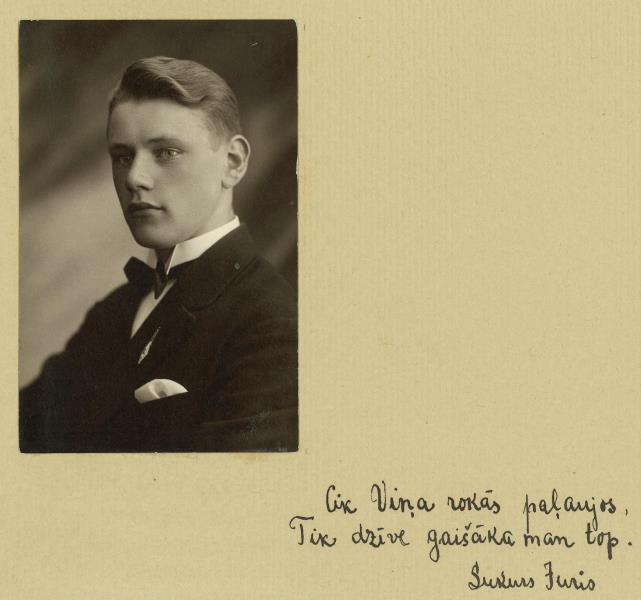 Fotogrāfija no Zentai Mauriņai 1939. gadā dāvinātā Mūrmuižas Tautas universitātes dalībnieku foto albuma. Fotogrāfijā redzams Juris Sukurs. Zem fotogrāfijas viņš ierakstījis: “Cik viņa rokās paļaujos, Tik dzīve gaišāka man top. Sukurs Juris". Fotogrāfijas apakšējā labajā stūrī iespiests fotogrāfa vārds: "G. Mattis Cēsis".