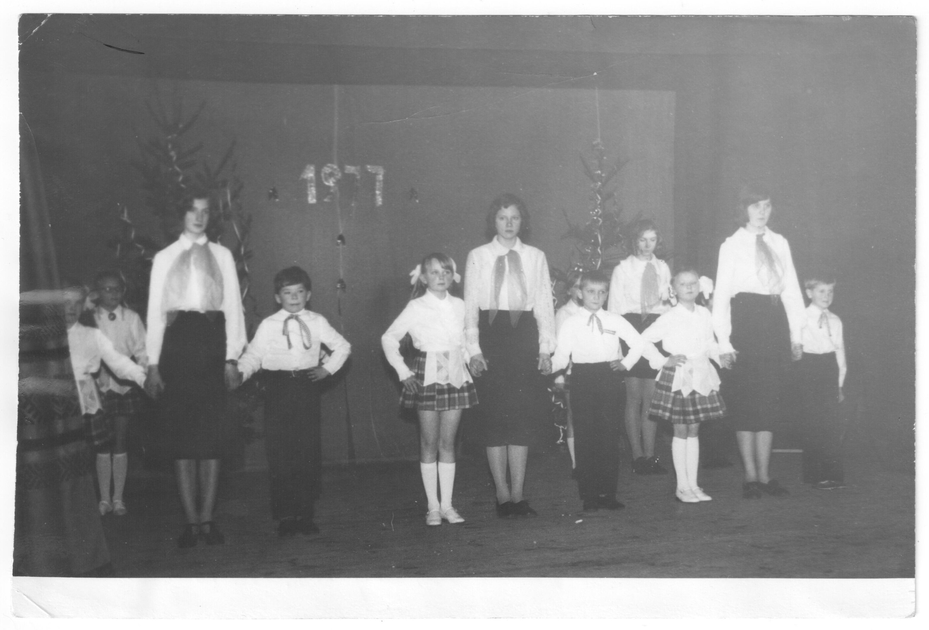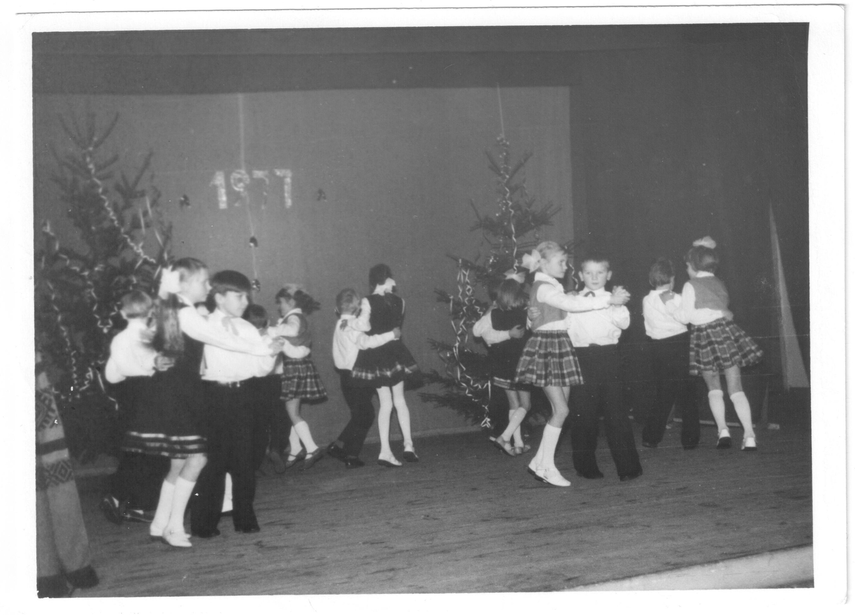 Krišjāņa Valdemāra astoņgadīgās skolas skolēni dejo un deklamē dzeju Jaungada eglītes pasākumā Beļavas tautas namā.