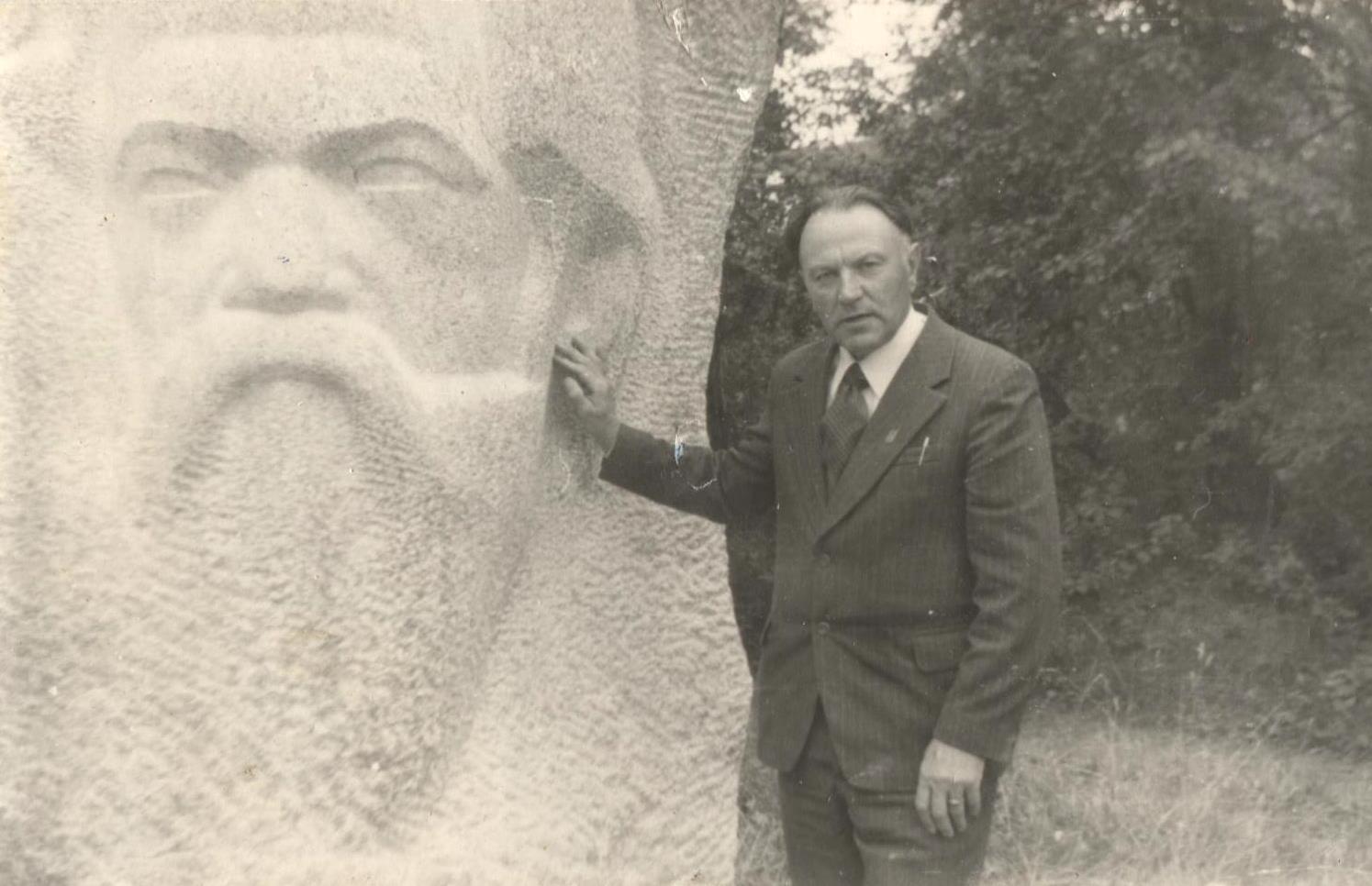 Aleksandrs Pelēcis. Fotografēta 1980.gados pie rakstnieka Jāņa Jaunsudrabiņa pieminekļa.