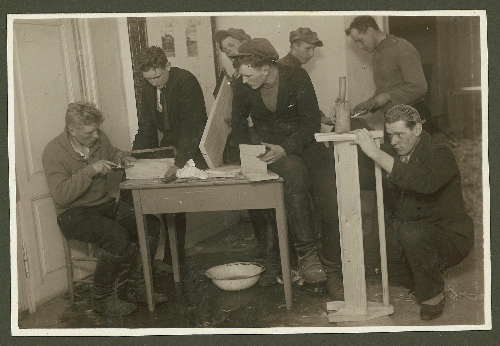 Fotogrāfija no Mūrmuižas Tautas universitātes 1930. - 1934. gadu albuma. Tajā redzama Mūrmuižas Tautas universitātes puišu grupa galdniecības darbu nodarbībā.