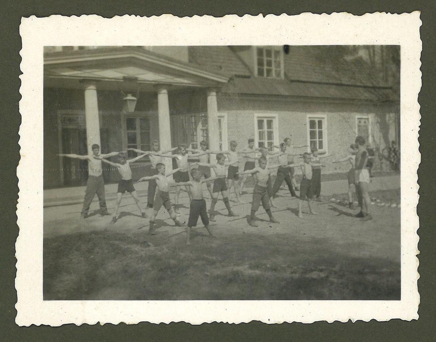 Fotogrāfija no Mūrmuižas Tautas universitātes 1930. - 1934. gadu albuma. Tajā redzama vingrošanas nodarbība pie Mūrmuižas Tautas universitātes ēkas. Visi vingrotāji ir zēni.