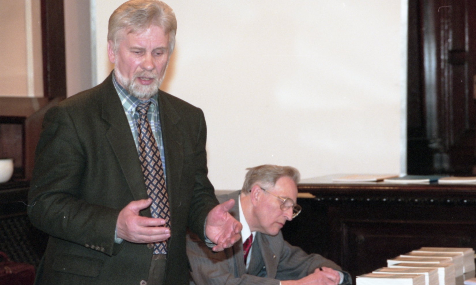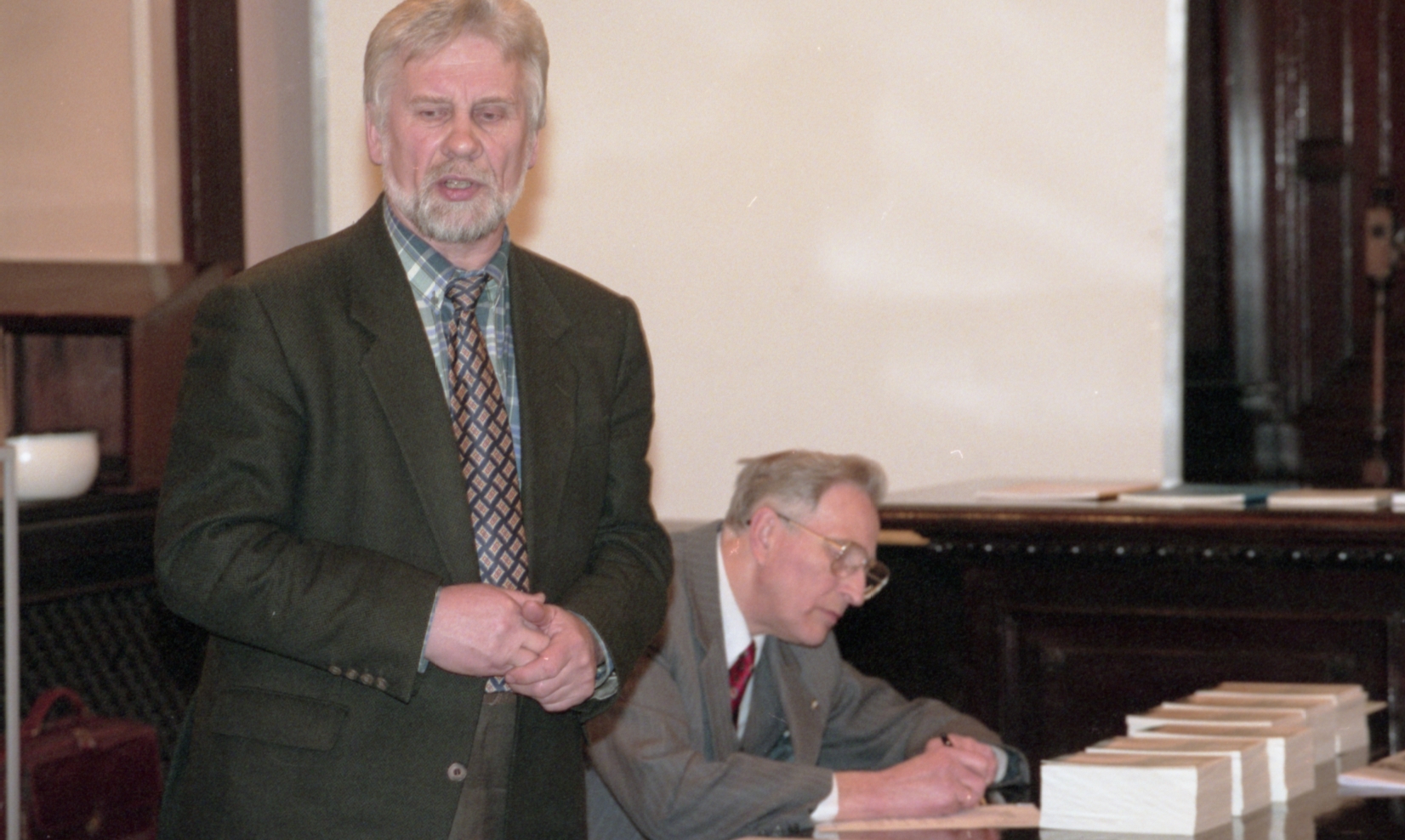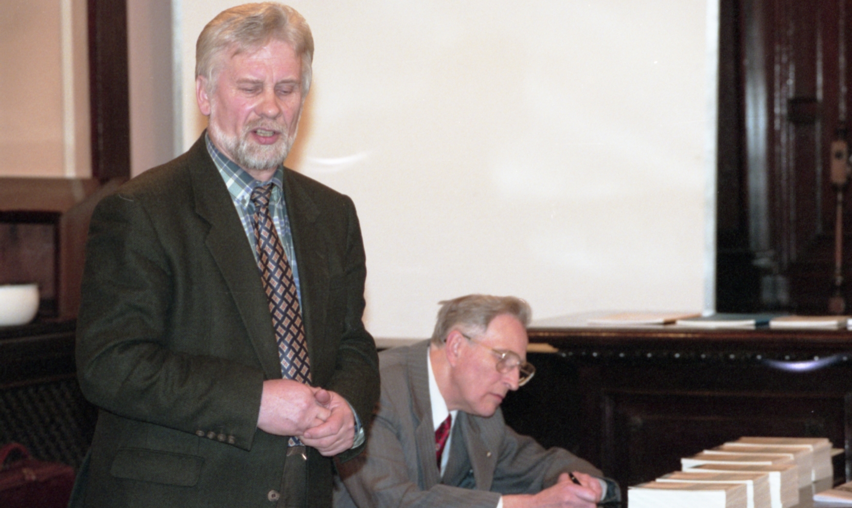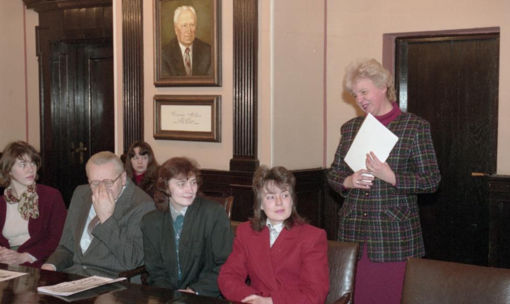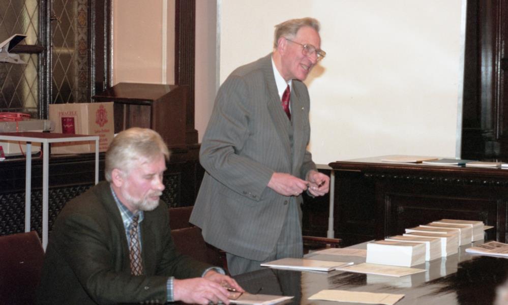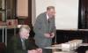 Grāmatu dāvināšana Latvijas universitātē. Profesors Imants Meijerovics, akadēmiķis Jānis Bārzdiņš, Ilona Ļegeņkaja, Aija Janbicka.